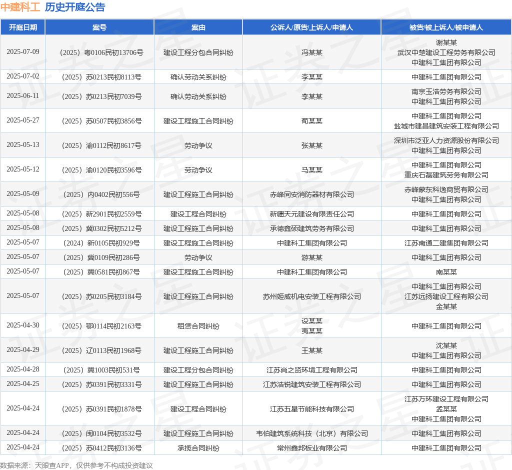 案号:(2025)渝0112民初8617号审理法院:重庆市渝北区人民法院案由:劳动争议当事人信息: 原告/上诉人:张某某 被告/被上诉人:深圳市泛亚人力资源股份有限公司、中建科工集团有限公司开庭日期:2025年5月13日根据统计,近一年内以中建科工集团有限公司为当事人的历史开庭公告有234则,其中案由为“建设工程分包合同纠纷”的公告以44则居首,其次为“劳动争议”有41则,“建设工程施工合同纠纷”有34则。历史开庭公告(前20条)如下: